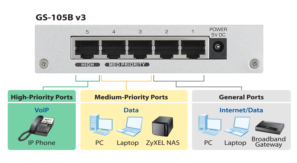 The GS-105B v3 has 3 QoS ports with an assigned high- and mediumpriority mechanism to enhance the stability of VoIP and data exchange. Just connect network devices such as IP phones, PCs, laptops or network storages to the high-priority or medium-priority ports of your choice, you can then enjoy smooth VoIP communication and data transfer at the same time.