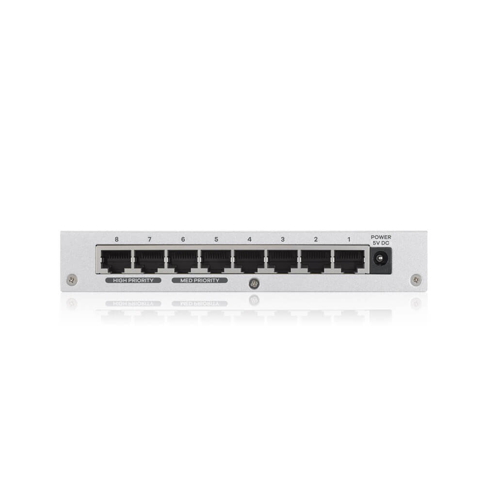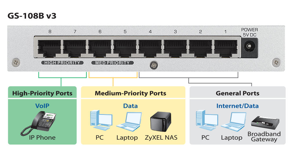 The Zyxel GS-108B v3 8-Port Desktop Gigabit Ethernet Switch connects network devices and the home network at blazing Gigabit speed. The newly designed QoS ports guarantee smooth transfer for bandwidth-intensive applications such as VoIP and data communications.