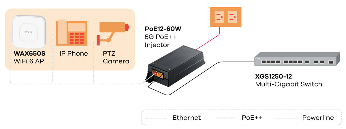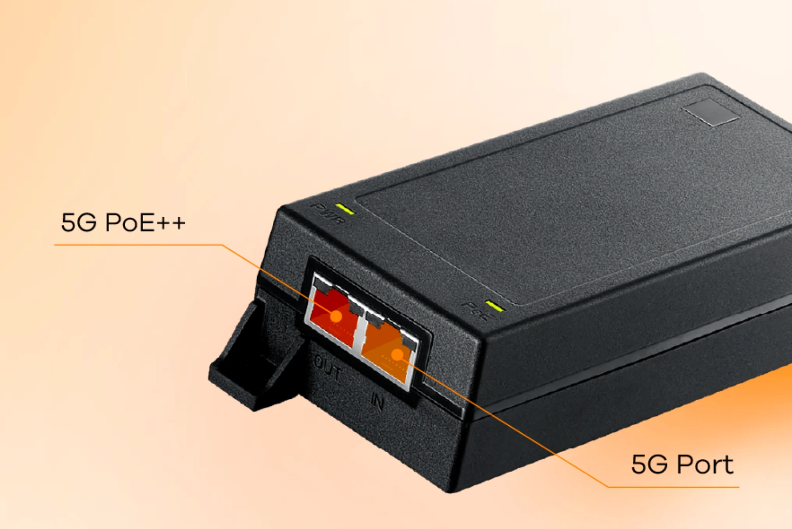 PoE12-60W is a Multi-Gigabit PoE injector supporting network speeds of up to 5Gbps. It is allowed to connect powered devices through existing Cat 5e or above cable.